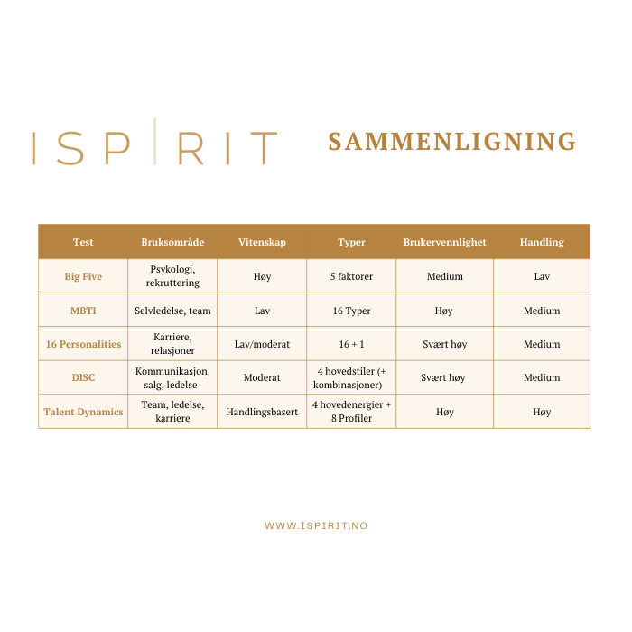 Personlighetstester forklart: Hva er forskjellen på Big Five, MBTI, DISC, 16 Personalities og Talent Dynamics?